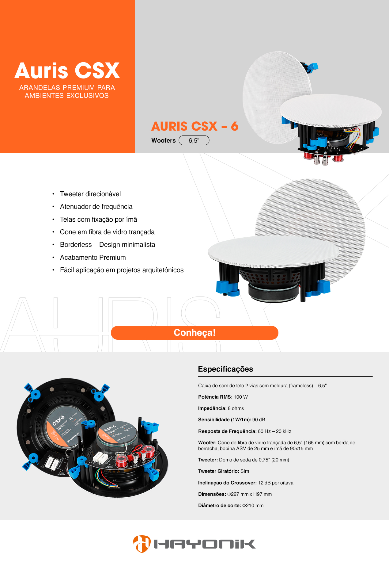 Suas telas, com fixação por ímã, garantem praticidade na instalação e manutenção, enquanto o cone em fibra de vidro trançada oferece durabilidade e excelente desempenho sonoro. Outro diferencial dessa linha é o design borderless, com acabamento premium, este modelo se torna ideal para projetos arquitetônicos que exigem discrição e elegância. A facilidade de aplicação torna a Auris CSX-6 uma escolha indispensável para quem deseja aliar tecnologia e beleza em seus espaços.