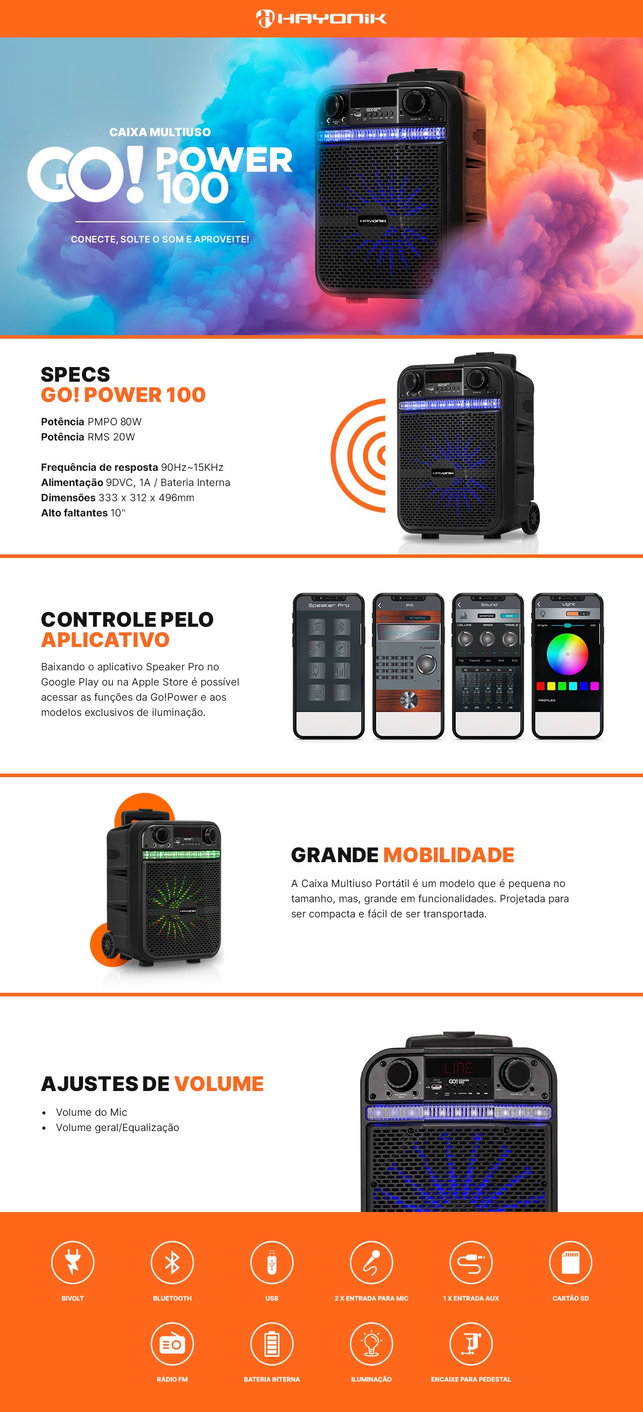 A Caixa Multiuso Portátil Hayonik Go Power 100 é um modelo que é pequena no tamanho, mas, grande em funcionalidades. Projetada para ser compacta e fácil de ser transportada. É ideal para sonorizar pequenos eventos como reuniões familiares, encontros de amigos, palestras, aulas de ginástica, entre tantas outras utilizações.
