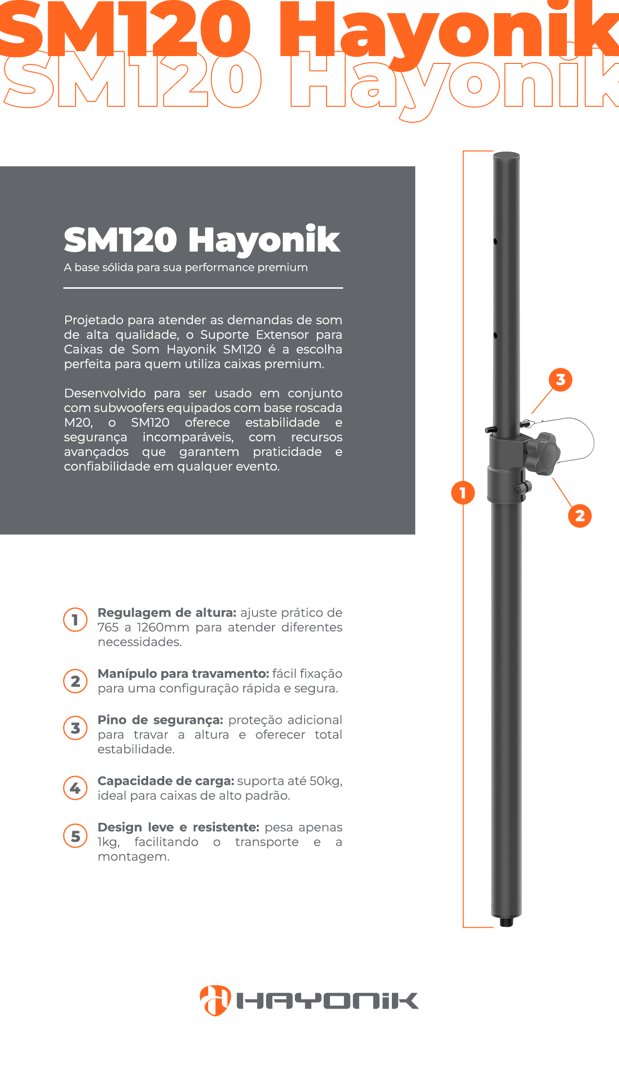 O Suporte Extensor Para Caixas de Som M20 - SM120 da Hayonik é um modelo projetado para oferecer robustez e estabilidade em ambientes de alta exigência, como feiras, eventos, palestras e clubes.